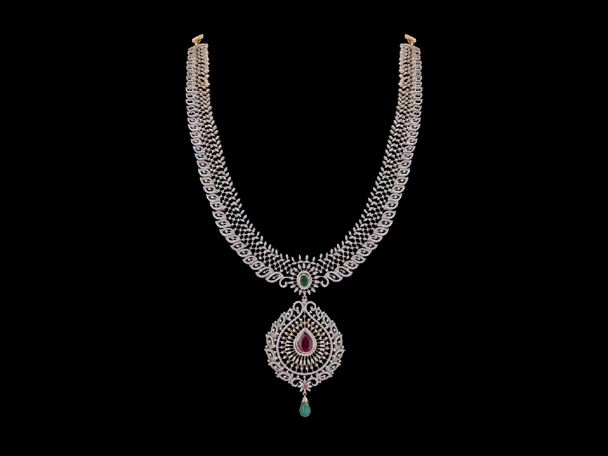Consisting of a chain with an interlocking pattern on the inside and a series of flame shaped structures on the outside bearing an oval stone, the beauty of the necklace lies within the large pendant that utilizes the same flame shaped structures along the outside and mimics the form of an eye, with a central drop shaped stone at its heart and a tiny stone drop dangling from it.