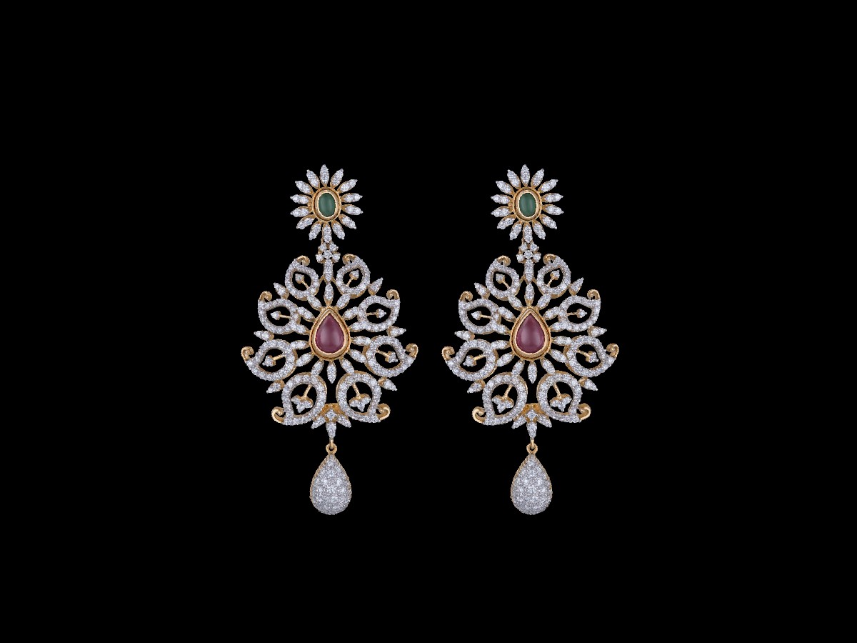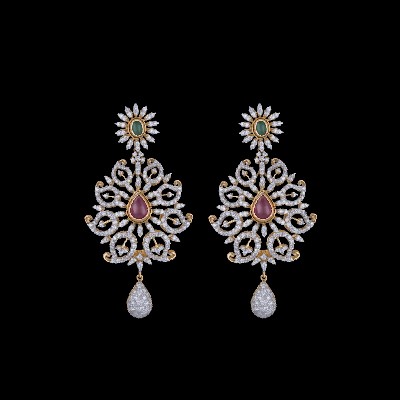 A sunflower shaped top bearing an oval stone leads to diamond lined leaves of varying sizes arranged in a circular, flowery fashion with a drop shaped stone at its heart. A tiny diamond studded water drop dangles from the ear ring, seeming like a dew drop falling from a flower