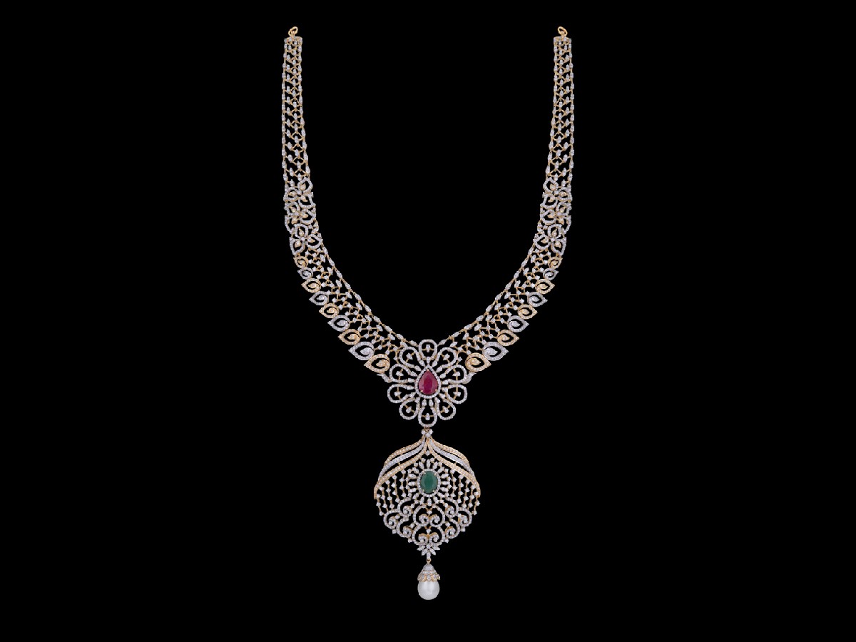 An exquisitely layered necklace chain with alternating gold lined leaves and a central drop shaped stone surrounded by diamond studded arcs lead to a minimal, circular pendant with an oval stone at its heart and a white pearl drop dangling from its base.