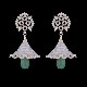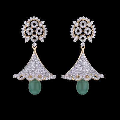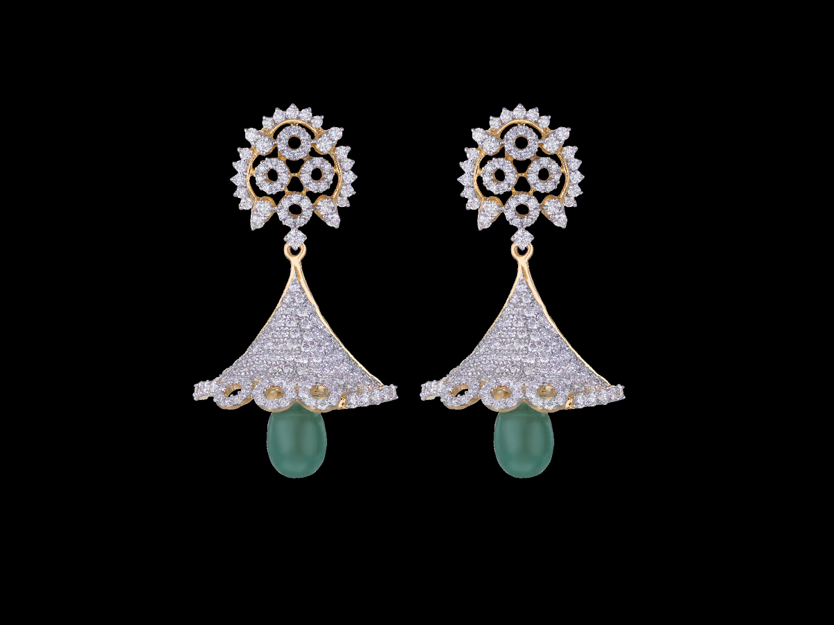 An elaborately designed crown plate leading to a conical, diamond studded umbrella like structure forms the simple but elegant Koni, with an oval grape-like structure dropping from the base of ear ring.