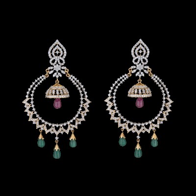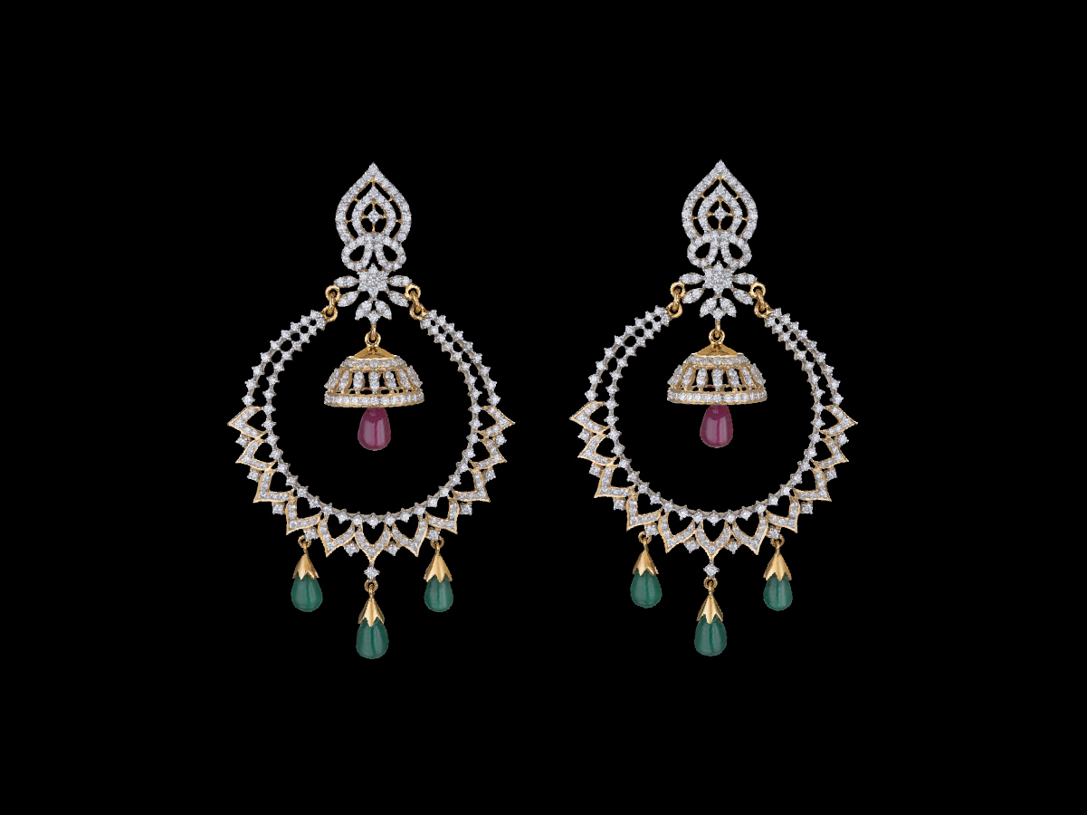 Two distinct circular orbs hinged to a crown shaped top that in turn bears an umbrella-like cradle makes this earrings a unique treat to wear. Three stones drop from the gold lined outer orb to give the luna cradle a much more dynamic look and feel.