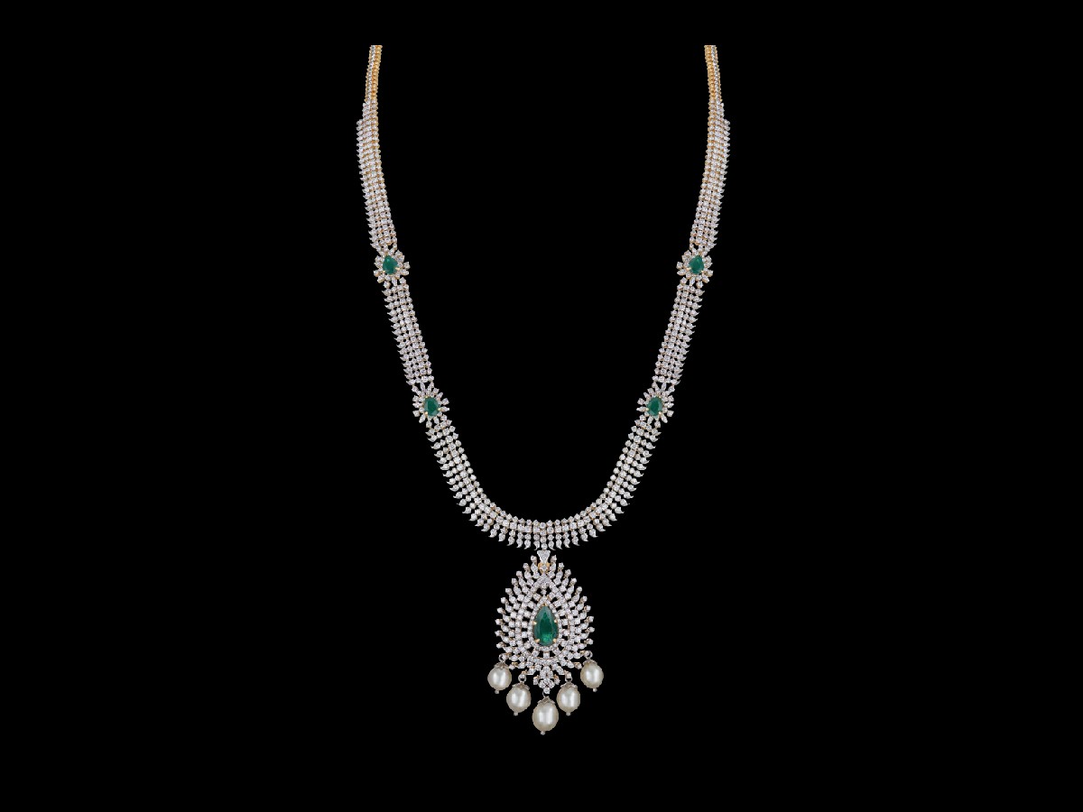 Lined with four rows of sparkling diamonds and interspersed with brilliantly cut stones, this diamond necklace is complimented by a water drop shaped pendant with pearl drops falling and a central stone on the pendant serving to catch the gaze of the onlooker.