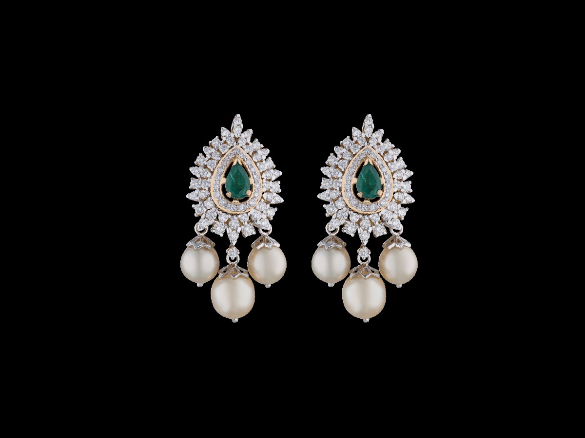 Three layers of drops shape this earrings, starting with a stone at its heart, followed by a line of diamonds within a golden enclosure and two rows of diamonds on the outside. The three pearl drops dangling from the earrings finish the jewel in all its glory.