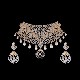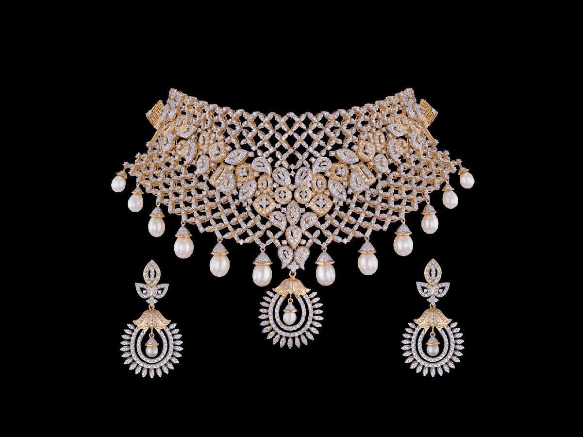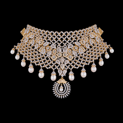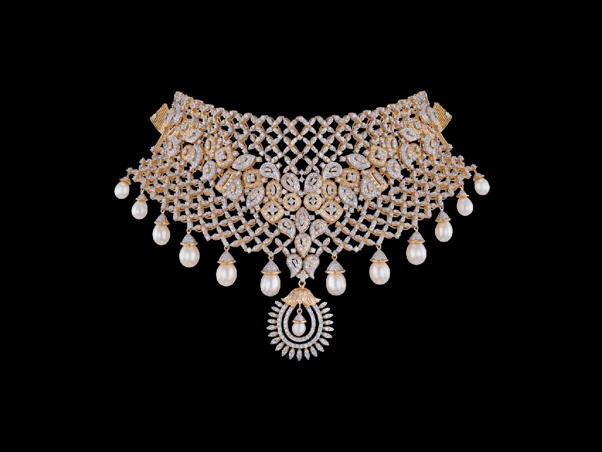 Forming a diamond studded mesh from end to end, the elaborate adornment has several oval and drop shaped embellishments concentrated at its centre, forming a V-shaped pattern with several diamond tipped oval pearls suspended from its base along with a regal looking emblem bearing a tiny pearl, to create this stunner of a chocker necklace.