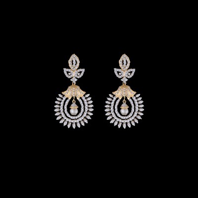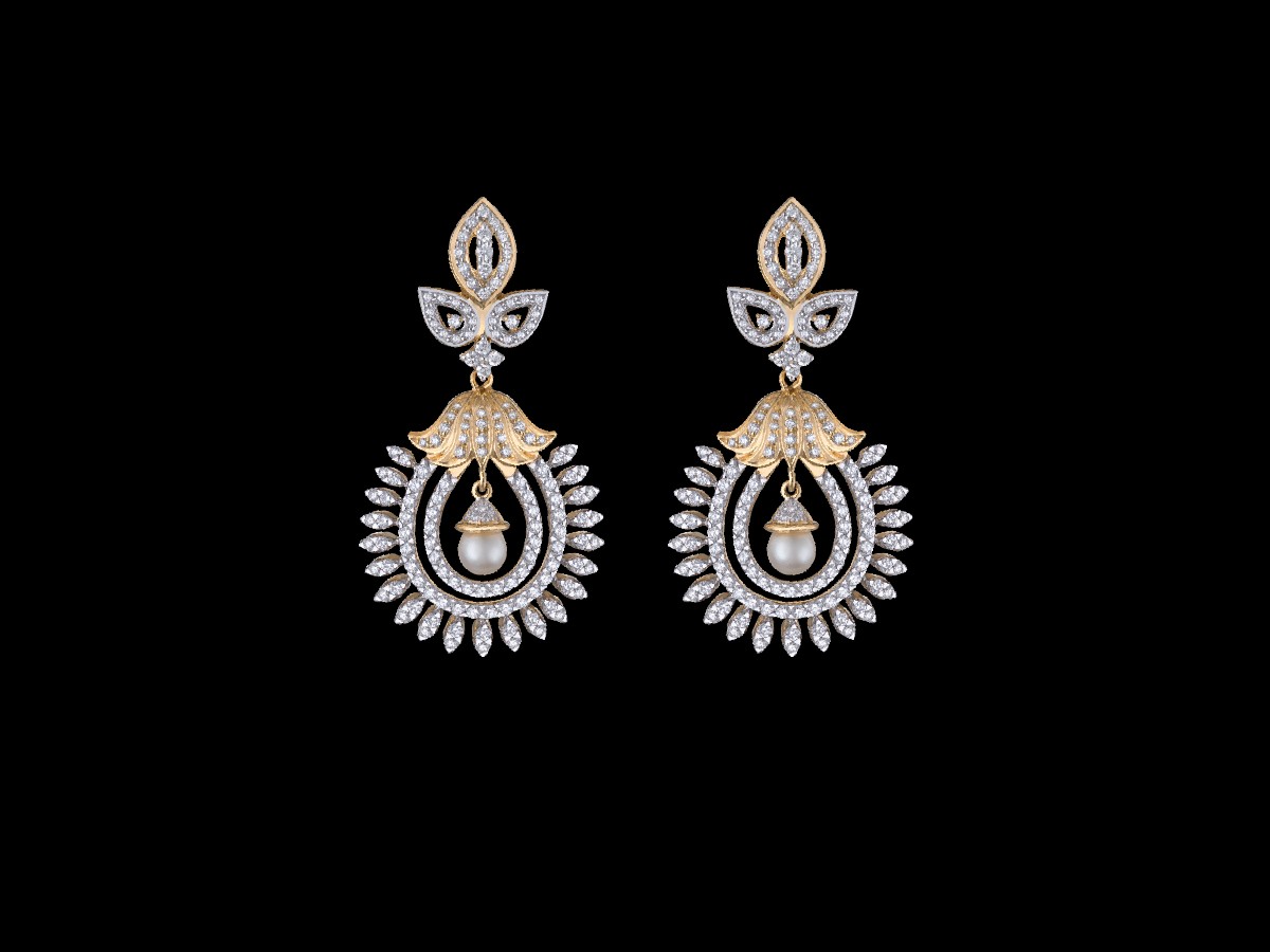 Topped with three leaf like structures, the centerpiece bears a regal looking, diamond studded emblem with an inverted gold flower at the top, rays emanating from the circular arcs and a tiny diamond tipped pearl suspended from the base of the flower to form this charming earrings for women and girls alike.