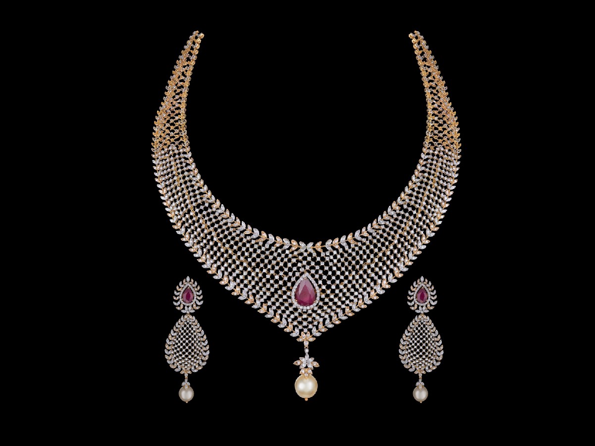 Donning a beautiful honeycomb design with studded diamonds throughout and bordered by a continuous vine of alternate gold and silver leaves on either side, the necklace bears a multifaceted stone drop surrounded by a line of diamonds and a white pearl dangling from the base.
