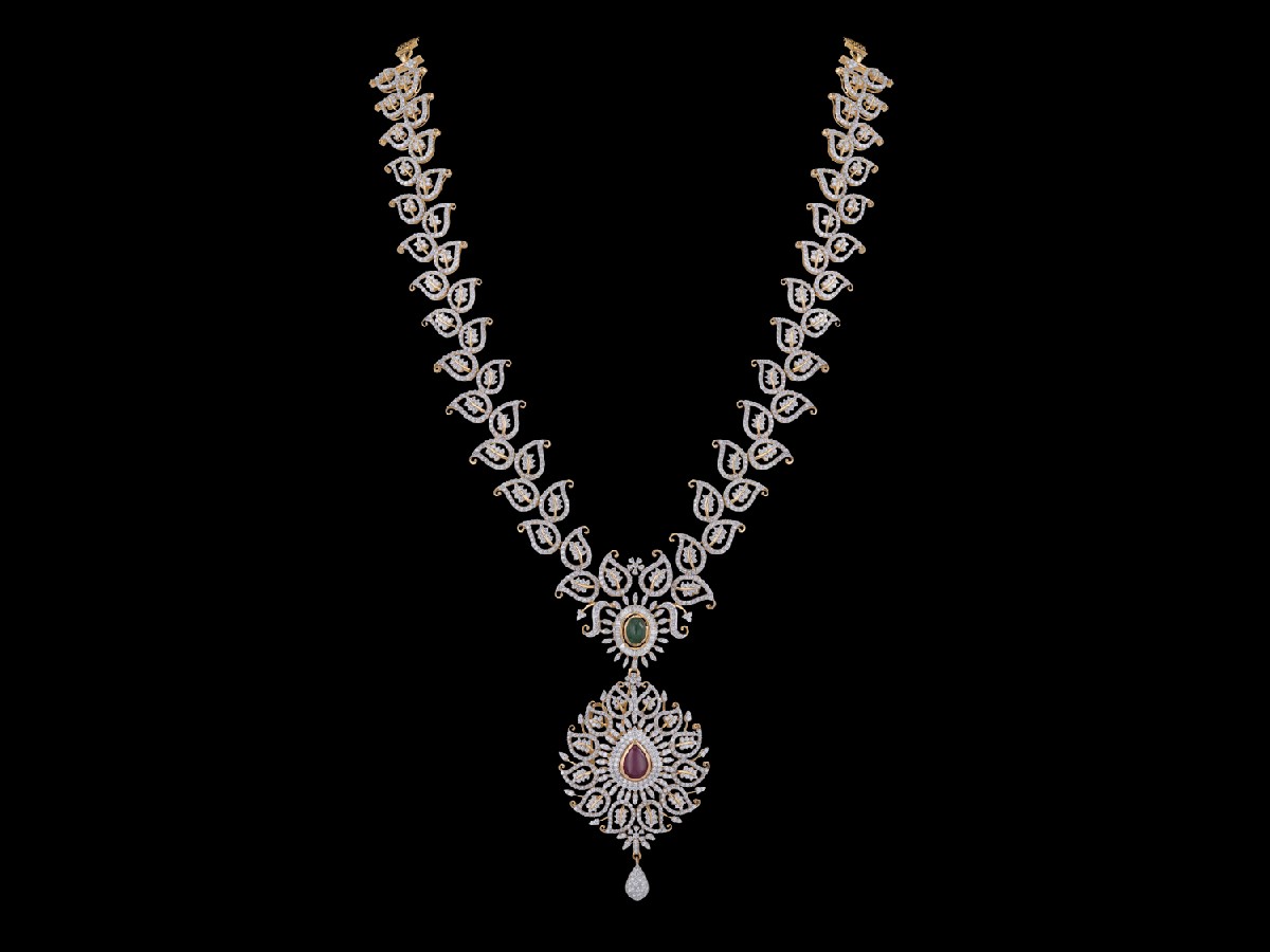 Bearing a series of diamond lined, twin leaves for the chain of the necklace, the ornament has at its base a radiating sun like structure with an oval stone. The leaves arranged in a circular fashion with a drop shaped stone at its heart forms the pendant, which serves as the highlight of the necklace, with a tiny, diamond studded water drop dangling from it.