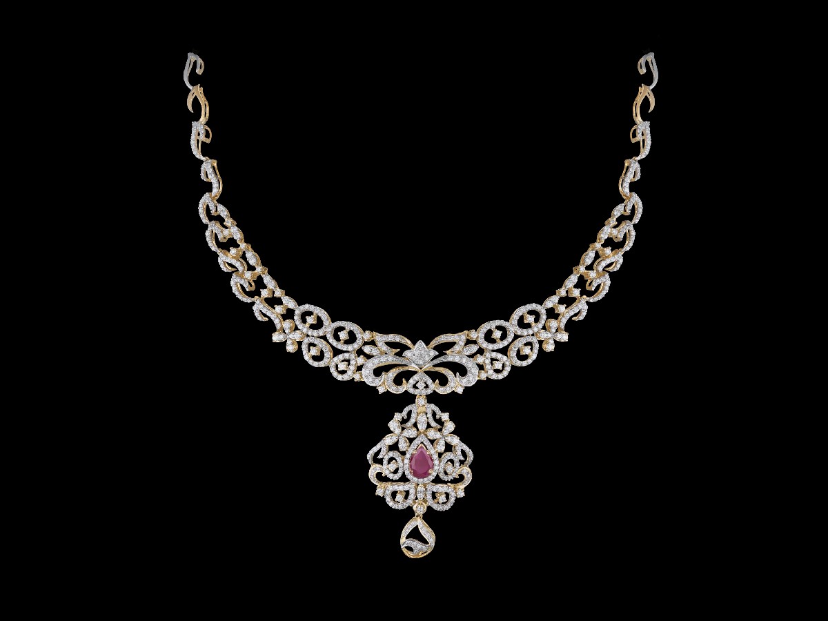 With the neck chain being composed of double layered loops and hook like structures, the necklace carries a multifaceted stone surrounded by a line of diamonds resembling the structure of a flower with a rather large dew drop gently grazing the petals and tipping over to its side.