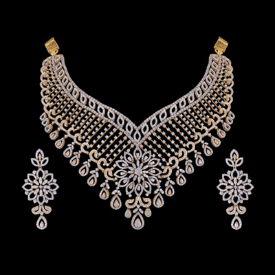A work of art from the master craftsmen at Vairra, the Dia necklace and earring set consists of an elaborately constructed necklace which forms the centerpiece in itself, brought to life with the sole purpose of draping a woman’s neckline with the most exquisite stones possible and a minimally designed earring to go with the necklace.