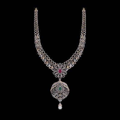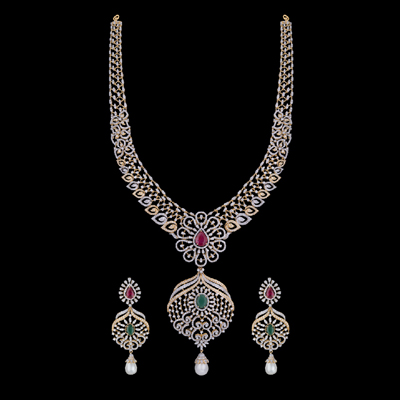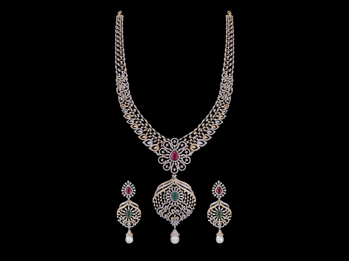 Exquisite in its construction and form, the farie necklace and ear ring set are a minimally designed ornamental set for the discerning women folk of today, mimicking the facial structure of a woman along with her hairline and a bindi. The larger stones on the necklace and earring can be customized in five different colors.