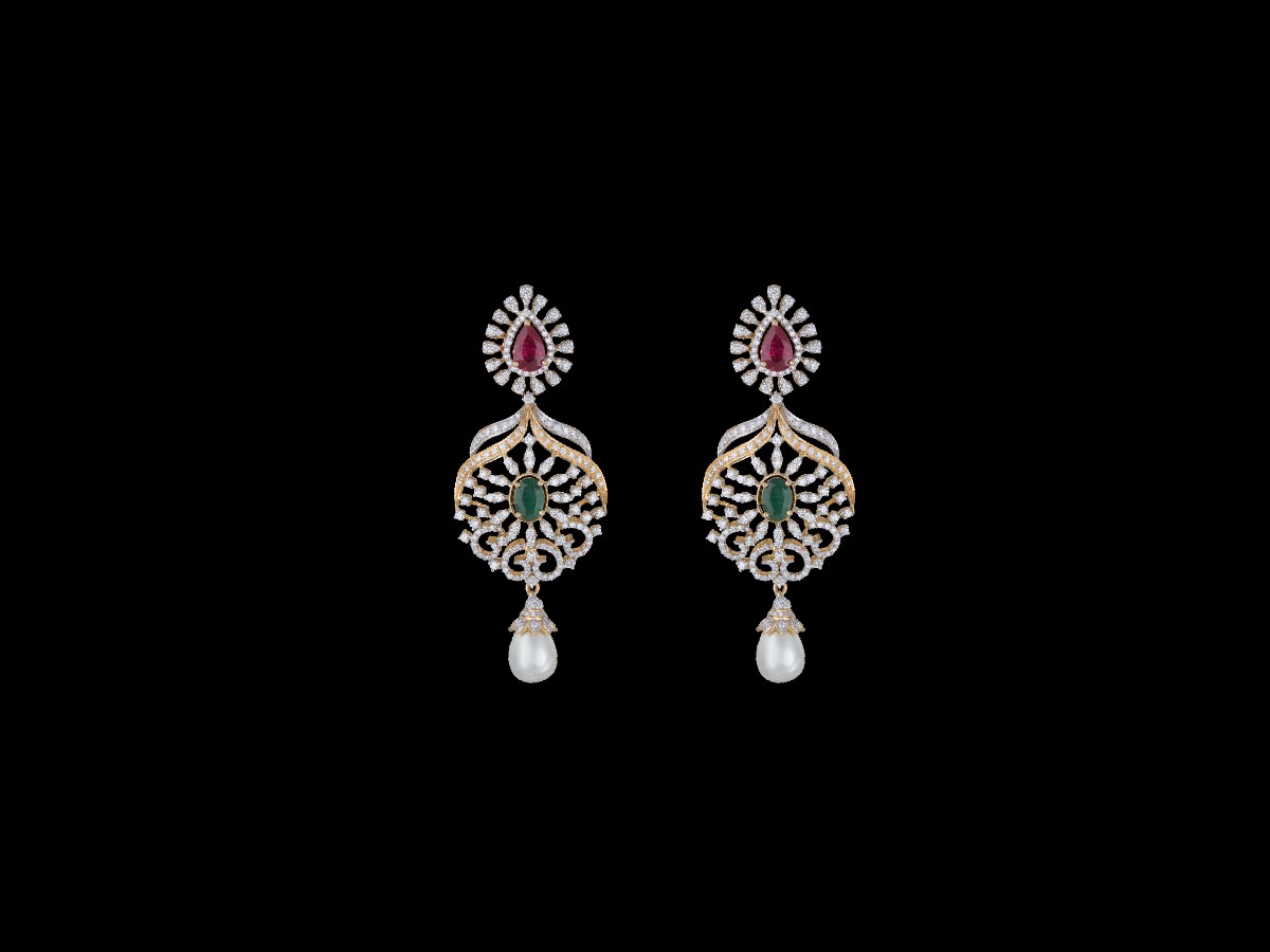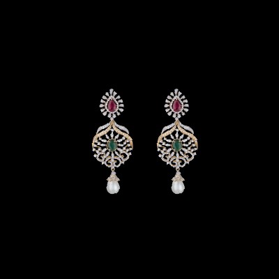 A drop shaped diamond studded top with a central stone leads to a minimal, circular earring with an oval stone and a white pearl drop dangling from it. A gold and silver-lined narrow leaf like structure tops the central portion of the earring, lending it a unique touch.