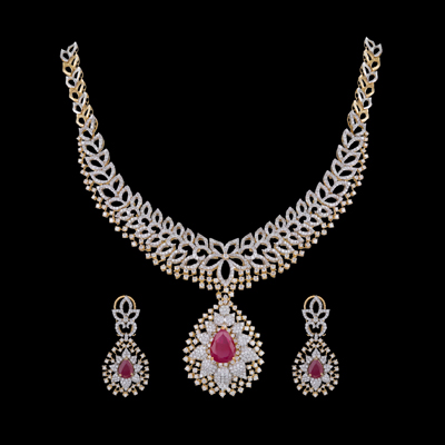 Bearing the mark of a flower at the necklace’s centre with successive petals lining the chain as it goes up, the ornament is bordered by a zig zag series of diamonds on the outside with the centre piece bearing a diamond encrusted flower and a drop shaped stone at its heart.
