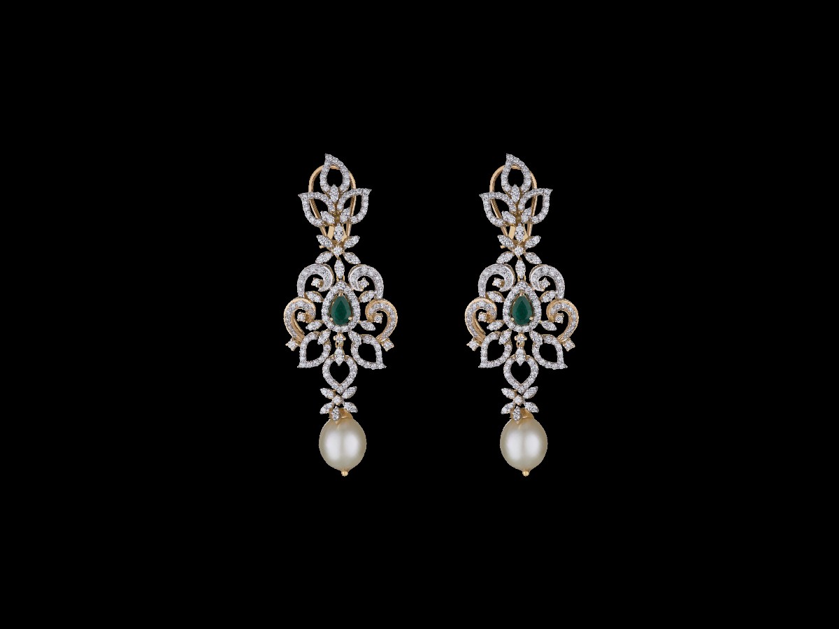 Topped by a metal loop with three leaf like structures, the center piece of the earring is made of leaf and musical note shaped embellishments with a drop stone at its heart, lined by a single layer of diamonds and a white pearl dangling from the earring.