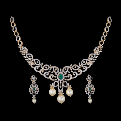 Topped with alternating gold and silver leaf shaped loops, the neckline is decorated by leaf and musical note shaped embellishments with a drop stone at its heart, lined by a single layer of diamonds and three white pearls dangling from leaf like structures extending at the base of the necklace.