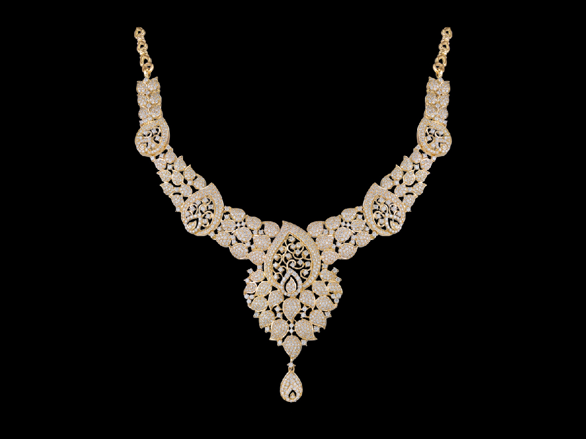 Draped in gold and made out of diamond studded leaves in its entirely along with intermittent embellishments and a heart shaped center piece bearing an encrusted drop, the Levianthan is most definitely the kind of adornment that stands a class apart, for the discerning and modern woman of today.