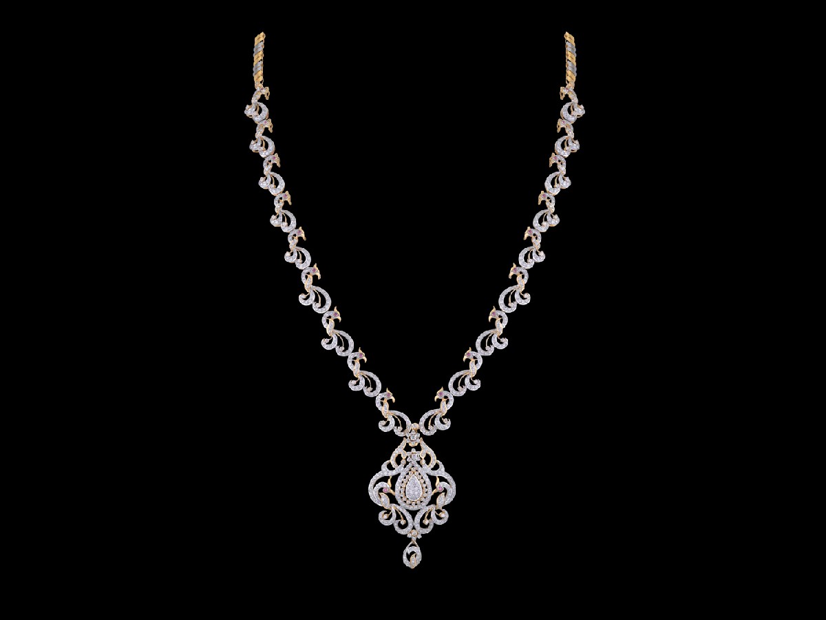 A series of diamond peacocks strung together, evocative of the peacock’s majestic dance, forms the core of this necklace. The fluid nature of this dance is brought out through the finely designed pattern of arcs and curves. A tinge of gold and tiny, colored stones for the eyes add grace and finesse to the Peacock’s Dance.