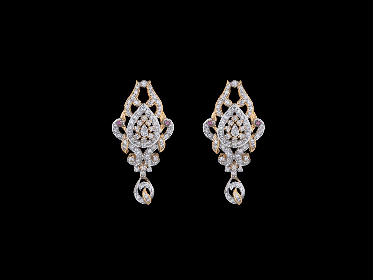 Two peacocks with their wings spread out and perched aside an intricately crafted diamond drop infuses an unprecedented level of beauty and charm into this earring. Fused together seamlessly, each half carries the elegance and grace of the peacock’s majestic dance.