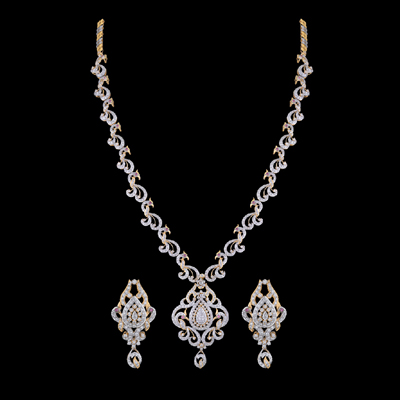 Add a spring in your step and move around with the grace of a peacock with this finely crafted necklace and earring set. Evocative of the elegance and charm exuded by the bird, this combination is sure to make heads turn toward the individual wearing them.