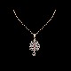 Carrying a multifaceted stone surrounded by a line of diamonds, the pendant resembles the structure of a flower with a rather large dew drop gently grazing the petals and tipping over to the side; a wavy pattern forming at the base of the drop. The Dew Drop comes with a gold chain and its central stone can be customized in five different colors.