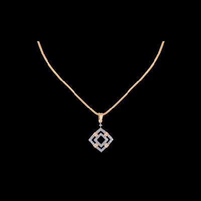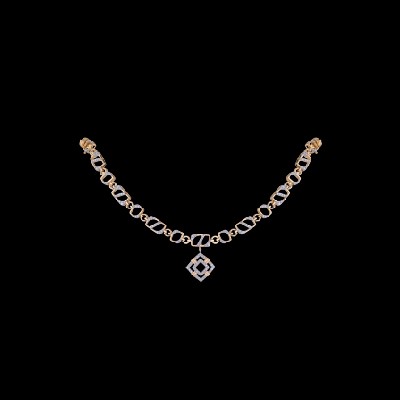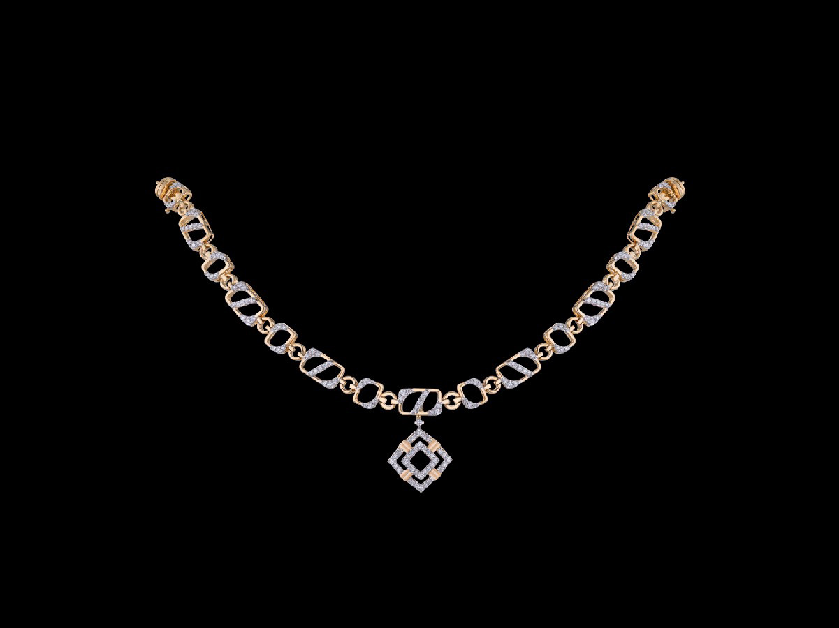 Made of a series of alternating single and double face rounded squares with diamonds studded on its opposing corners and the central division, the ornament bears a double layered diamond shape with a hint of gold wrapped around its sides to form this uniquely designed necklace.