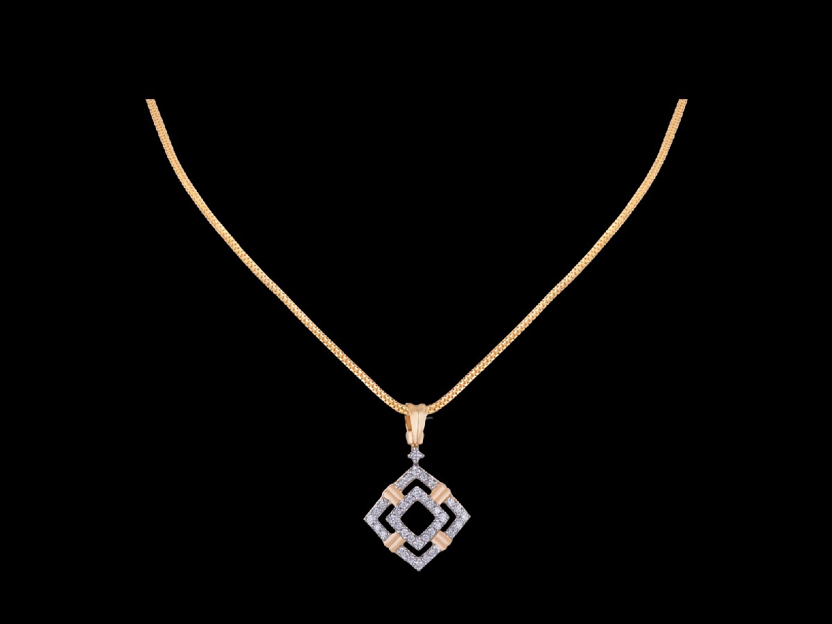 A double layered, diamond shaped and studded structure with a hint of gold wrapped around its sides is suspended on a tubular gold chain to form this beautiful and minimal pendant.