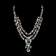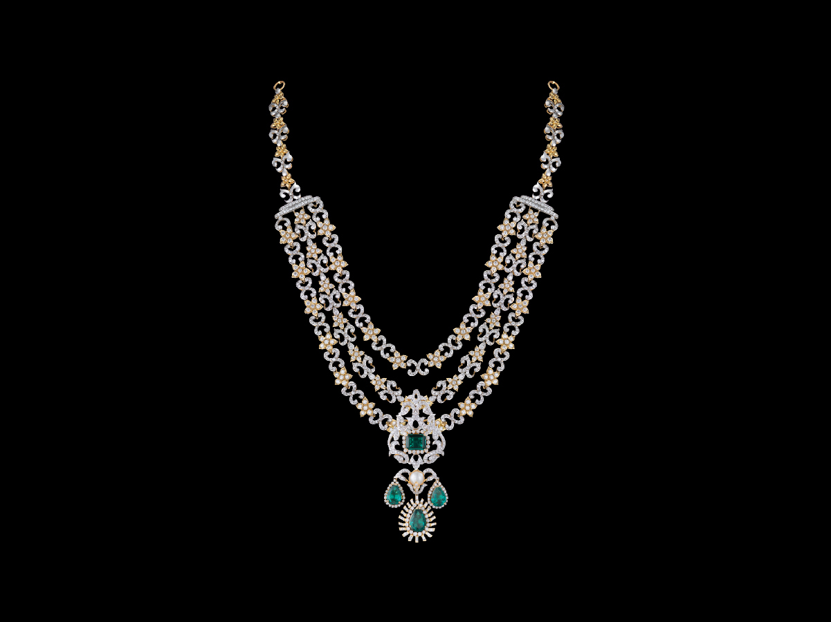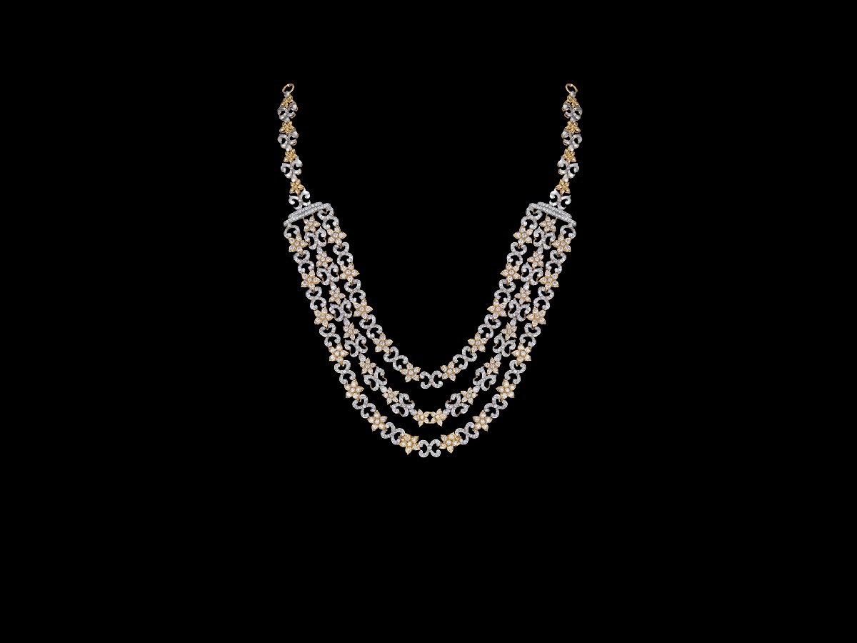 A single chain diverges into a chocker style necklace with alternating gold lined stars and symbolic lookalikes of mirrored hearts and butterflies, forming a sea of golden and silver patterns studded with diamonds.