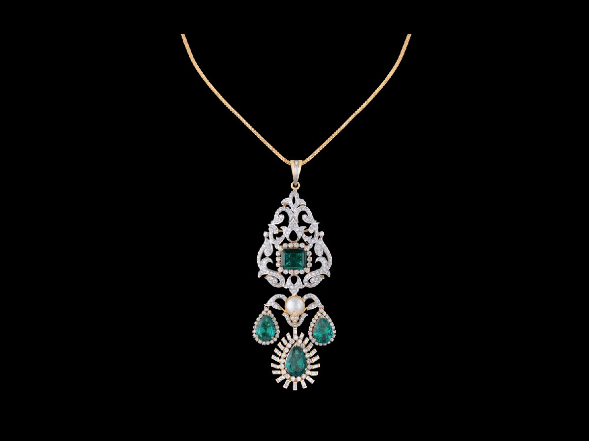 An inverted trident consisting of three stones with the central stone throwing out rays, as if from the core of the sun, and a triangular crown-like top with a central stone form this unconventionally shaped but beautiful pendant.
