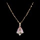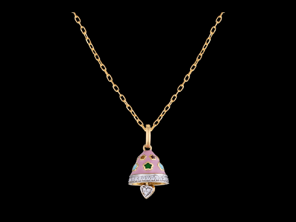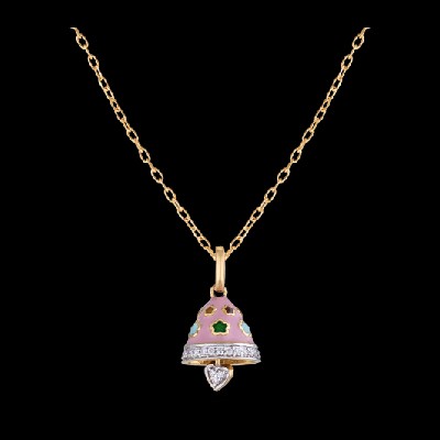 A miniature pink bell with little flowers embossed on its surface and a layer of diamonds on the bottom, holding a heart shaped, diamond studded clapper is suspended from an interlocking gold chain using a plain gold clasp to form this simple, understated pendant for kids.