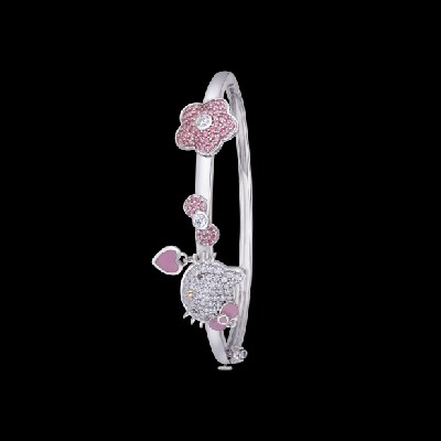 A diamond encrusted ‘Hello Kitty’ inspired character is the centre of attraction of this silver bangle bracelet along with a flower and bowtie that are dotted with pink diamonds. A small heart shaped object is suspended from the bracelet on one side, making it a cute accessory young girls would love to possess.