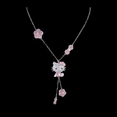 A diamond encrusted ‘Hello Kitty’ inspired character is the heart of this necklace with two shorter chains holding a flower and bowtie that are dotted with pink diamonds. The neck chain holds a bigger version of the flower and bowtie, one on each side, making this necklace a must-have accessory in a young girl’s jewel box.