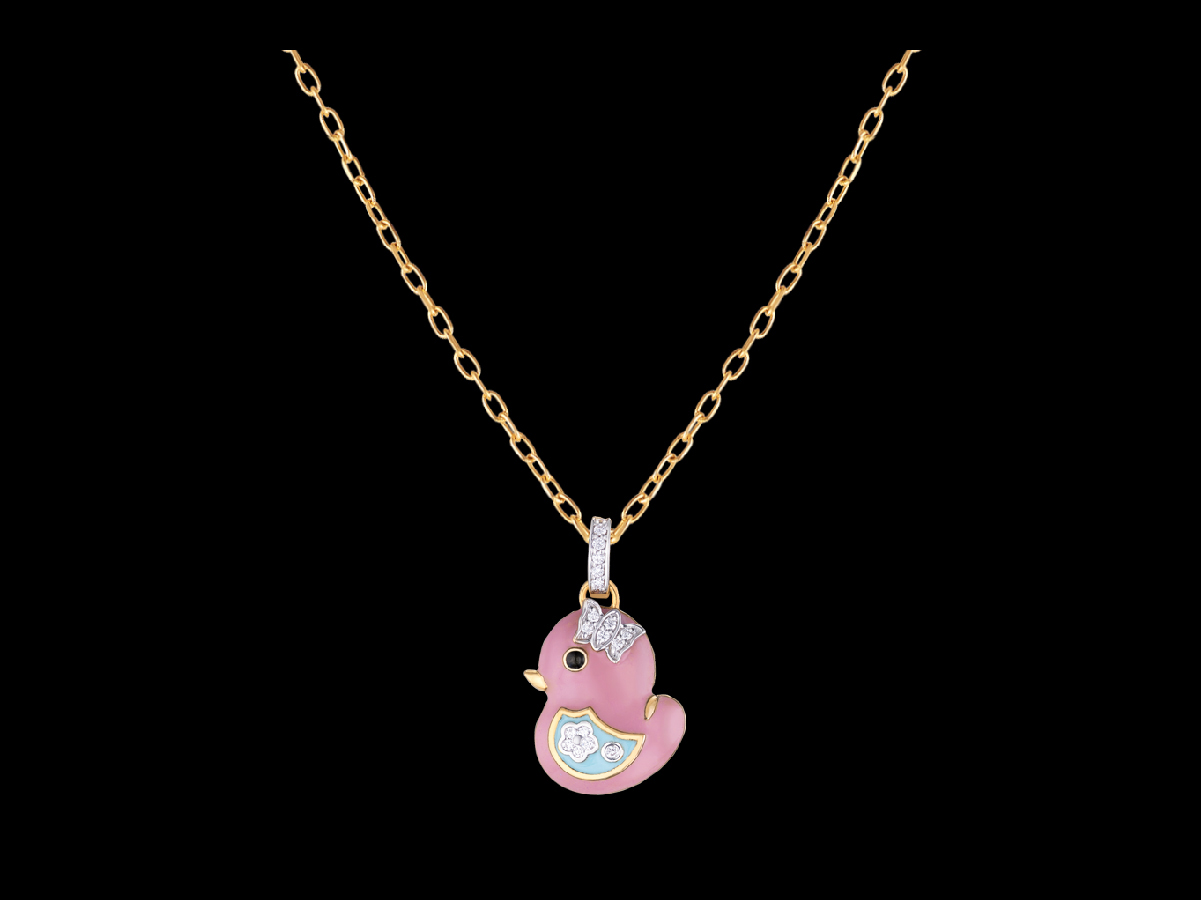 A miniature pink duckling with a diamond studded, butterfly shaped bow and flower on its wing is suspended from an interlocking gold chain using a single line, diamond studded clasp to form this simple, understated pendant for kids.