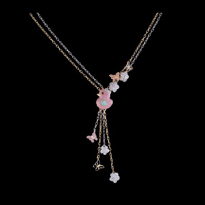 Consisting of a slender, gold and silver interlocking chain with a miniature pink duckling attached to its ends, the duoduck necklace extends further below, holding tiny diamond studded flowers and colorful butterflies at its short ends, as well as to one side of the chain lining the neck. A cute, quirky and adorable accessory for kids and little women.