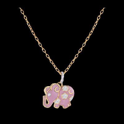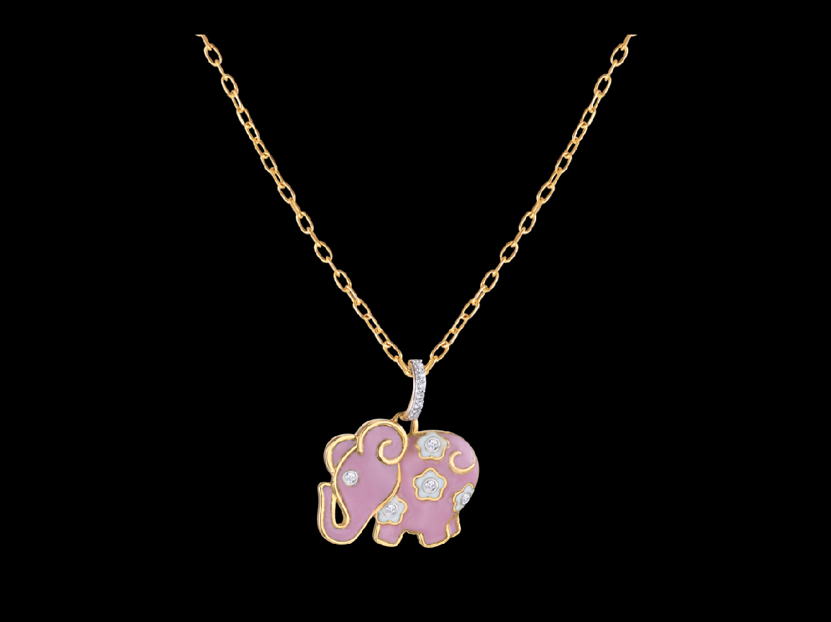 A miniature pink elephant with gold lining is suspended from an interlocking gold chain using a single line, diamond studded clasp to form this simple, understated pendant for kids.