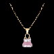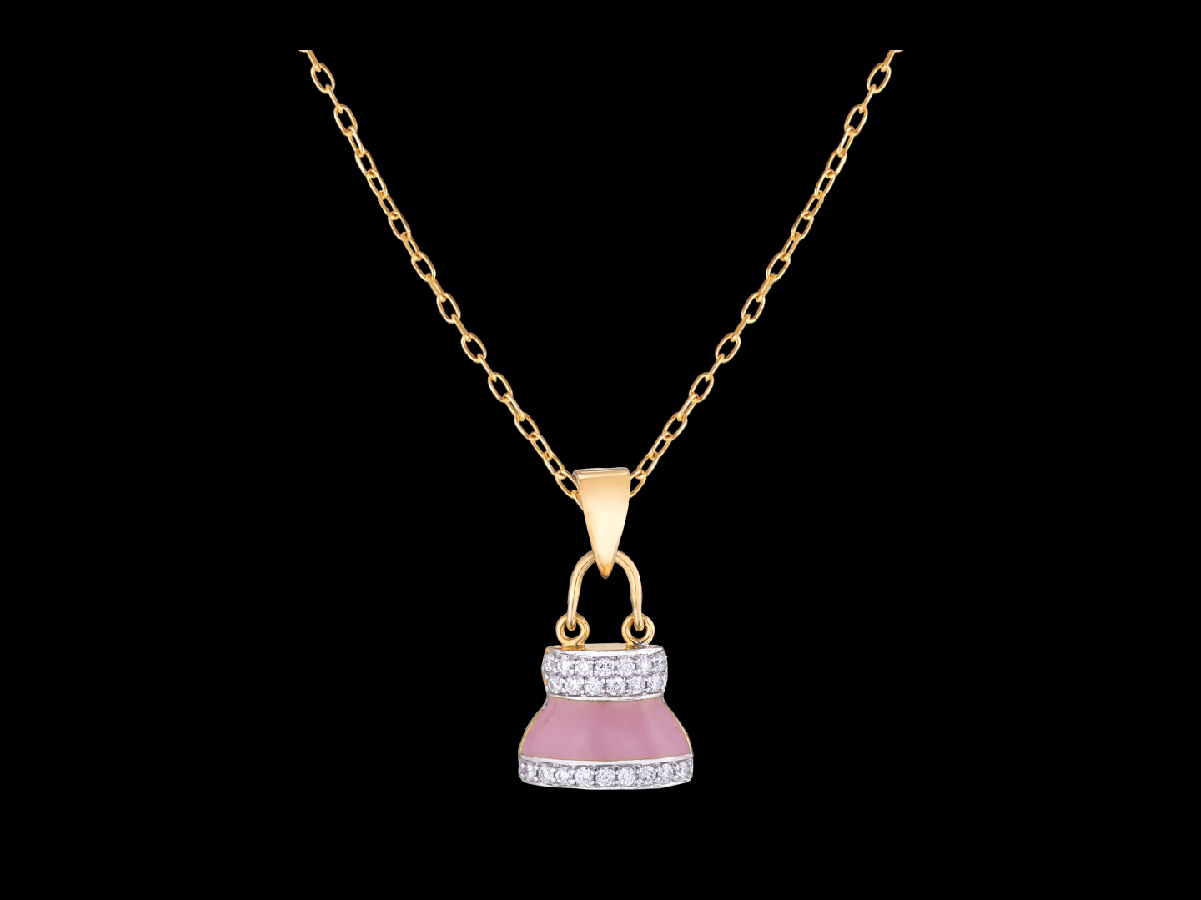 A pink, diamond studded miniature frock is suspended from an interlocking gold chain with a triangular clasp on two hinges, attached together by an arched structure to form this simple, understated pendant for kids.