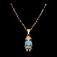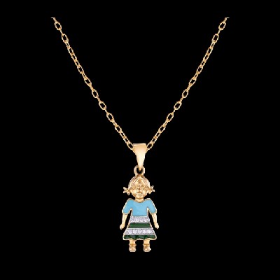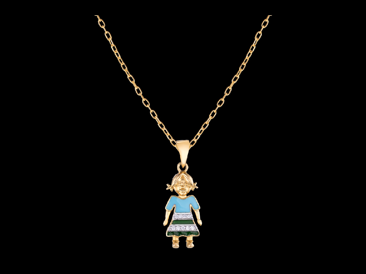 A miniature short ponytailed girl with a blue-green dress combination and two lines of studded diamonds along the waist and towards the bottom of the dress is suspended from an interlocking gold chain using a plain gold clasp to form this simple, understated pendant for kids.